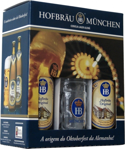Conteúdo deste Kit: 2 garrafas de cerveja Hofbräu Original e 1 caneca Hofbräu de 300 ml.